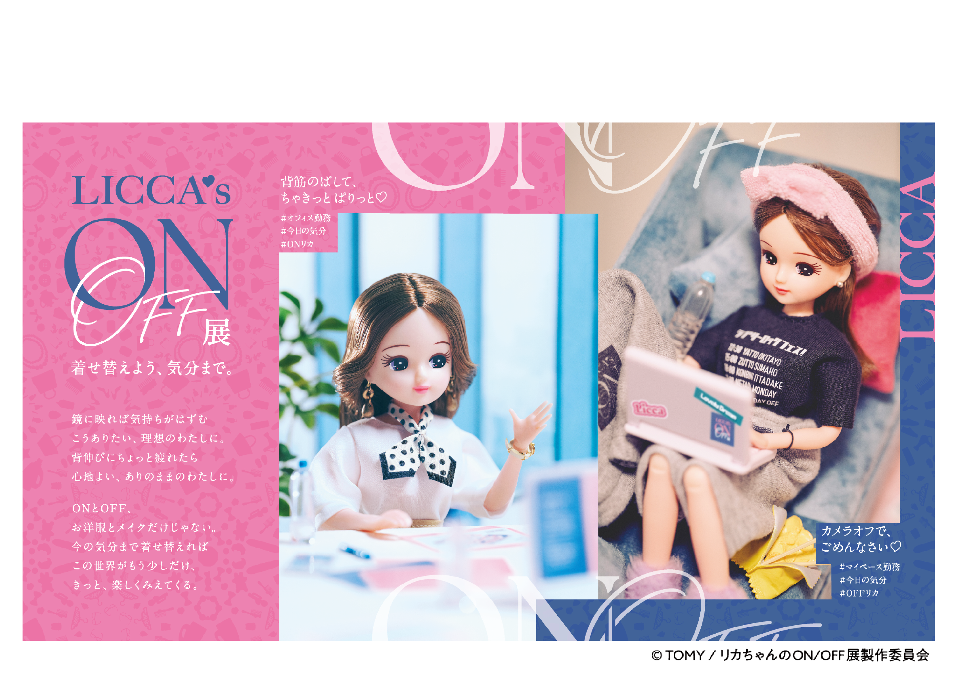 1967年の発売以来、世代を超えて愛され続ける「リカちゃん」。今ではリカちゃんとともに時代を歩んできた大人にも愛されるブランドとして人気を確立し、SNSを中心に「#リカ活(※1)」と呼ばれる大人のリカちゃん遊びが広がっています。本展では、ONとOFFを自由に切り替えながら“わたしらしい時間”を楽しむリカちゃんの姿を通じて、仕事もプライベートも大切にしながら生きる現代のライフスタイルを表現。OFFを楽しむからこそ、ONも頑張れる——そんなポジティブなメッセージを届けます。※1 リカちゃんのコーディネート、洋服作り、 SNS への写真投稿など、大人のリカちゃんの楽しみ方全般